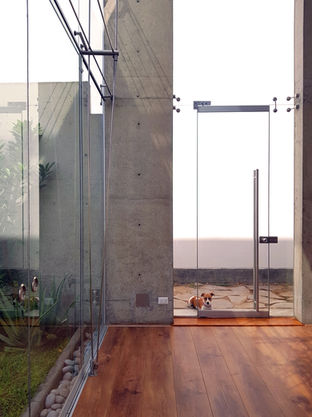 La distribución se resuelve con un semisótano donde se ubica el área de servicio, un primer piso con la cocina y los ambientes sociales en doble altura ambos en relación con la terraza, piscina y jardines; en el segundo piso se disponen cuatro dormitorios con baños y closets individuales y un estar familiar que se configura como mezanine en relación con el área social del primer nivel. La expresión arquitectónica combina principalmente el concreto caravista con la ligereza del vidrio y acero complementándose con la calidez de la madera todo ello dispuesto en su expresión natural.